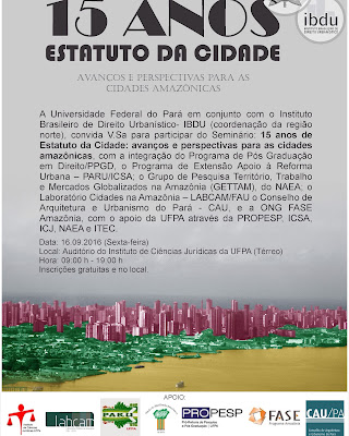 Nesta sexta-feira, 16, das 9h às 19h, a UFPA promove, em parceria com o Instituto Brasileiro de Direito Urbanístico, o seminário “15 anos de Estatuto da Cidade: avanços e perspectivas para as cidades amazônicas”. Todos os interessados podem participar gratuitamente e se inscrever no próprio local, o auditório do Instituto de Ciências Jurídicas. O Programa de Pós Graduação em Direito, o Programa de Extensão e Apoio à Reforma Urbana, o Grupo de Pesquisa Território, Trabalho e Mercados Globalizados na Amazônia, do Núcleo de Altos Estudos Amazônicos – NAEA, e o Laboratório Cidades na Amazônia participam da iniciativa. Aproveitem.