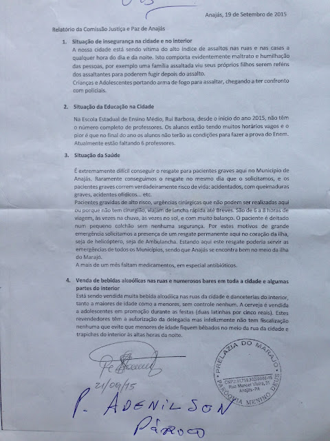 Menino Deus, em Anajás, recentemente produziu um relatório quanto à situação
