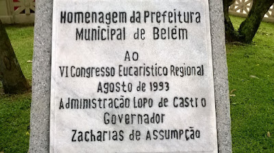 A memória de Belém do Pará parece caso perdido, literalmente. A placa instalada na Praça do Pescador, em frente à Estação das Docas, informa que o VI Congresso Eucarístico Regional foi em 1993. Na verdade, o VI Congresso Eucarístico foi Nacional, realizado no período de 10 a 16 de agosto de 1953, e teve como palco aquela que ficou conhecida como Praça do Congresso, depois mudada para Praça Kennedy e finalmente Praça Waldemar Henrique e não o local onde está. Observador atento, o advogado Célio Simões, membro do Instituto Histórico e Geográfico do Pará, inconformado, fotografou a aberração e enviou ao blog, que agradece a contribuição e aponta mais: Zacharias de Assumpção governou o Pará de 1.951 a 1956. E Lopo de Castro foi prefeito de Belém no período de 1951 a 1.953. Ou seja: ao invés de prestar uma informação histórica, a placa presta um desserviço, com informações totalmente equivocadas, além de evidente erro de acentuação.