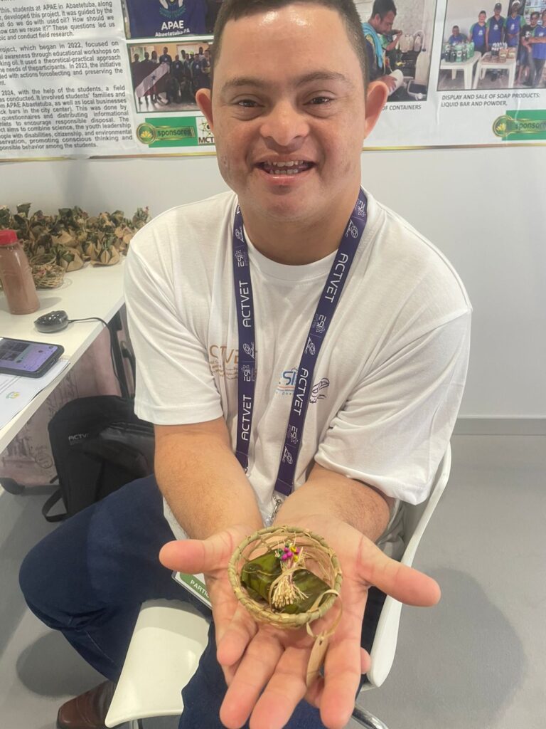 Eduardo é aluno da Apae de Abaetetuba no Atendimento Educacional Especializado (AEE). Morador do Ramal do Maranhão, na zona rural do município, ele se tornou o primeiro pesquisador com síndrome de Down a defender um projeto científico nesse evento internacional. Munido de fone de ouvido e aplicativo de tradução, conseguiu dialogar com visitantes de diferentes nacionalidades. “Gostei muito de apresentar o nosso trabalho e quero continuar falando desse projeto. Me emocionei ao representar os meus colegas, professores e minha família”, contou, emocionado.