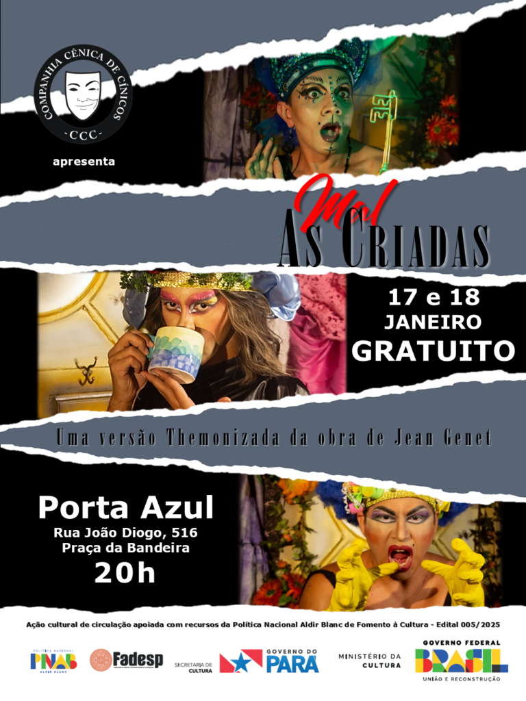 A Caranava das Mal Criadas inicia 2026 levando aos palcos parauaras o espetáculo “As Mal Criadas”, da Companhia Cênica de Cínicos. A montagem, que dialoga com o teatro político e a estética drag, percorre Belém, Bragança e Soure durante o mês de janeiro, com apresentações gratuitas e acessíveis ao público. A Caravana das Mal Criadas marca um investimento consistente na circulação de obras teatrais no interior e no fomento a linguagens contemporâneas que ampliam o repertório cultural do estado.