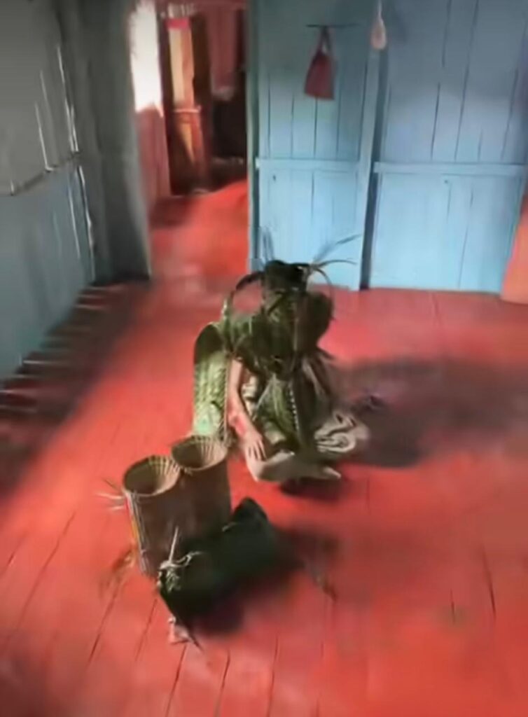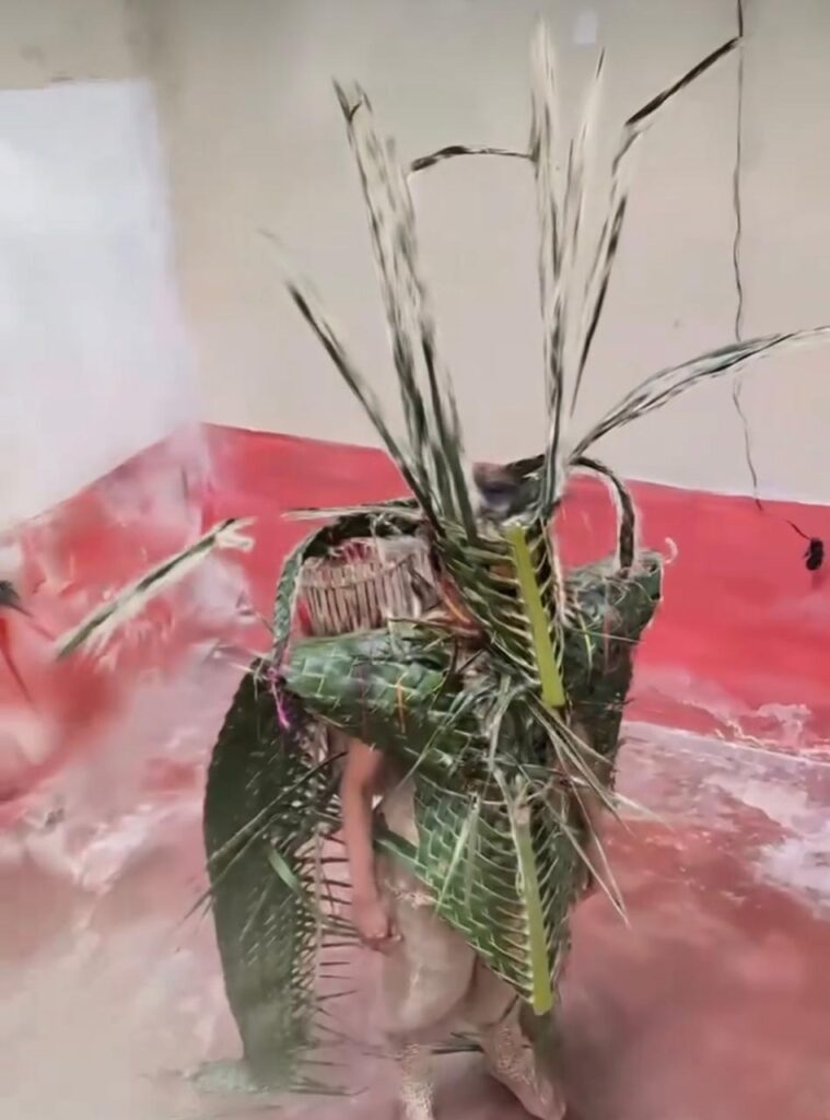O visitante, por sua vez, é quem dá a direção a este passeio, manuseando uma grande cabeça de cestaria suspensa em frente à projeção. Com quatro faces que remetem à geometria das cerâmicas marajoaras, ela funciona como leme, dando caminhos, causando turbulências nas imagens e alterando a direção dos futuros ali representados.