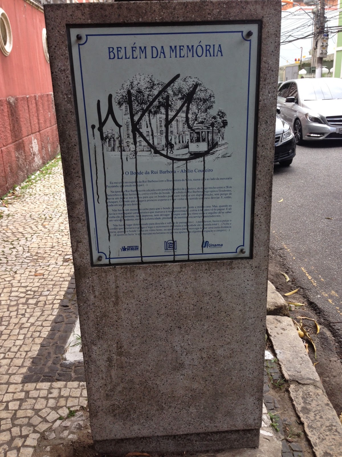 É chocante o estado em que se encontram as placas do projeto “Belém da memória”, bela iniciativa que merece a adesão de todos e o apoio maciço da sociedade. Esta é a placa instalada na esquina da Tv. Rui Barbosa com a Av. Governador José Malcher, com um texto de Abílio Couceiro sobre “O bonde da Rui Barbosa”. Vamos fazer uma campanha em defesa da cidade, impedindo a ação de vândalos, que podem ser detidos em flagrante delito por qualquer cidadão, no ato de destruição do patrimônio público. E a pena deve ser o serviço comunitário, amplamente divulgados os nomes dos infratores, a fim de que criem vergonha na cara!