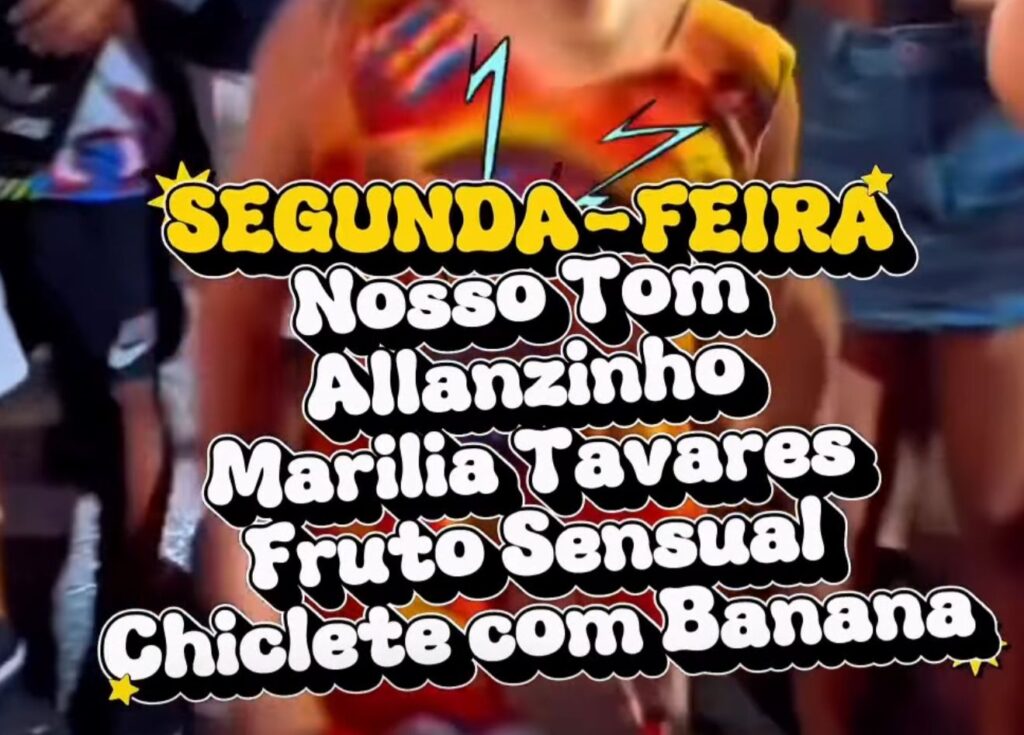 Na segunda-feira, apresentam-se Nosso Tom, Allanzinho, Marília Tavares, Fruto Sensual e Chiclete com Banana.