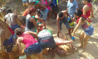 A fome, a desigualdade, a pobreza, promovem cenas deprimentes. Hoje, o caminhão baú que transporta carnes bovinas e suínas dos animais abatidos no matadouro municipal de Soure, no arquipélago do Marajó, teve uma de suas laterais rompidas, e toda a carne caiu na rua de chão batido. Os funcionários da Prefeitura recolheram tudo e levaram de volta para o matadouro, como se observa no vídeo aí em cima, e o prefeito Guto Gouvêa mandou enterrar a carne, por considerar que estava imprópria ao consumo humano, perto do lixão, às 15h. Só que populares foram lá, desenterraram as peças e levaram para comer. Vejam as fotos, chocantes.