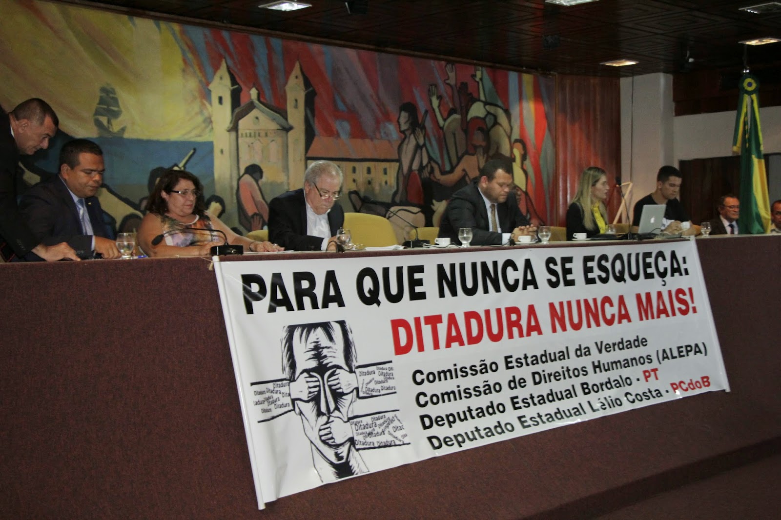 * Documento conjunto da Comissão Estadual da Verdade do Pará e da Comissão de Direitos Humanos da Alepa, lido e assinado por todas as entidades representadas na audiência pública de hoje, inclusive pelo secretário de Estado de Justiça e Direitos Humanos, Michel Durans, representando o Governo do Estado, e as vereadoras Sandra Batista e Marinor Brito, da Comissão de Direitos Humanos da Câmara Municipal de Belém.