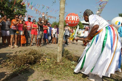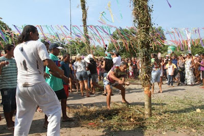 O encerramento foi hoje de manhã, com a “Cecuiara“. Para simbolizar o final da programação, comunidade e visitantes cumprem o ritual de derrubada dos mastros, a golpes de machado. Este ano, o grupo dos homens ganhou das mulheres a competição de levante e derrubada.