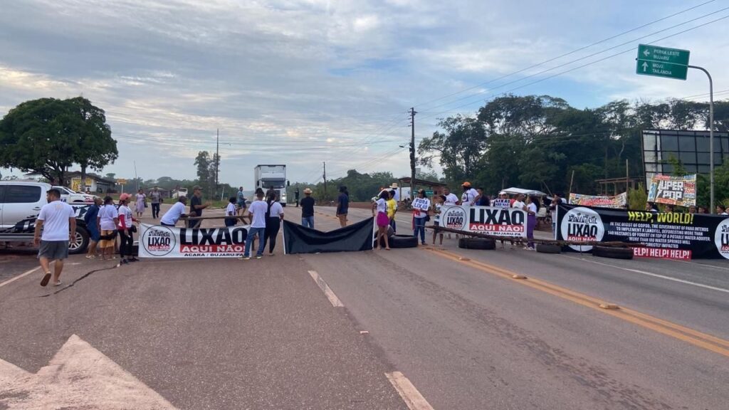Desde as 5h da madrugada desta sexta-feira (21) comunidades quilombolas e moradores de vilas da região estão bloqueando totalmente a PA-483 (Alça Viária), no Trevo Perna Leste. O protesto reúne centenas de pessoas contra a decisão judicial que permite estudos para a instalação de um aterro sanitário no município de Acará (PA), pela empresa Ciclus Amazônia. A interdição na altura do Km 24 e Km 32 causou uma fila quilométrica de veículos particulares, vans e ônibus, nos dois sentidos da via.