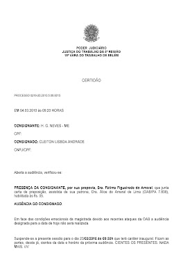 Ainda repercute no meio forense a justificativa – oficial – da juíza Paula Maria Pereira Soares, titular da 15ª VTB, para não realizar audiência a partir das 09:10 da manhã, na sexta-feira passada. Leiam aí em cima, com os seus próprios olhos, que a terra há de comer.