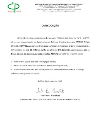 A nomeação da última colocada na lista tríplice para o cargo de Defensor Público Geral está alcançando grande repercussão em todo o Pará. Hoje, na Assembleia Legislativa, os líderes do PMDB, deputado Iran Lima, e do PCdoB, Lélio Costa e Silva, bateram forte, afirmando que a nova DPG Jeniffer de Barros Rodrigues Araújo foi ungida por ser amiga pessoal dos filhos do governador Simão Jatene. Por sua vez, o governo divulgou nota em que sustenta que a escolha se deu após análise técnica dos programas de gestão de cada candidato. A Associação dos Defensores Públicos do Estado do Pará publicou uma nota oficial, de manhã, considerada amena demais, e a pressão interna foi tão forte que a entidade acabou recuando e ao fim da tarde convocou Assembleia Geral Extraordinária para o próximo dia 3, a partir das 14h, e consta na pauta a proposta de nova nota oficial, desta vez de desagravo e exigindo a revogação do ato do governador, além da paralisação das atividades da Defensoria. A reunião tem tudo para ser explosiva, em contraste com o clima de união verificado ao término das eleições, em que as próprias duas concorrentes se manifestaram publicamente em apoio ao mais votado na lista tríplice, José Arruda.
