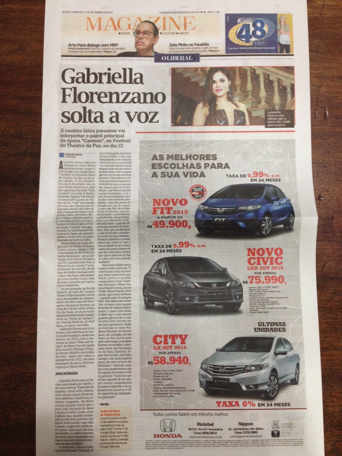 O caderno Magazine, de O Liberal, publica hoje matéria de capa com a cantora lírica Gabriella Florenzano. Agradeço muitíssimo ao escritor e jornalista Vicente Cecim, que a entrevistou, aos jornalistas Antonio Carlos Darwich (editor) e Lázaro Moraes(diretor de redação), e ao diretor Ronaldo Maiorana, por abrirem espaço à divulgação de seu trabalho.