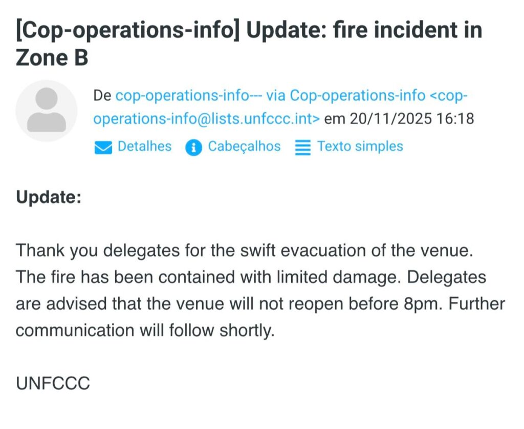 0 Publicado em: 20 de novembro de 2025 A ONU comunicou oficialmente que os danos do incêndio na Blue Zone foram limitados, que a COP 30 não reabrirá antes das 20h e mais informações serão divulgadas em breve.