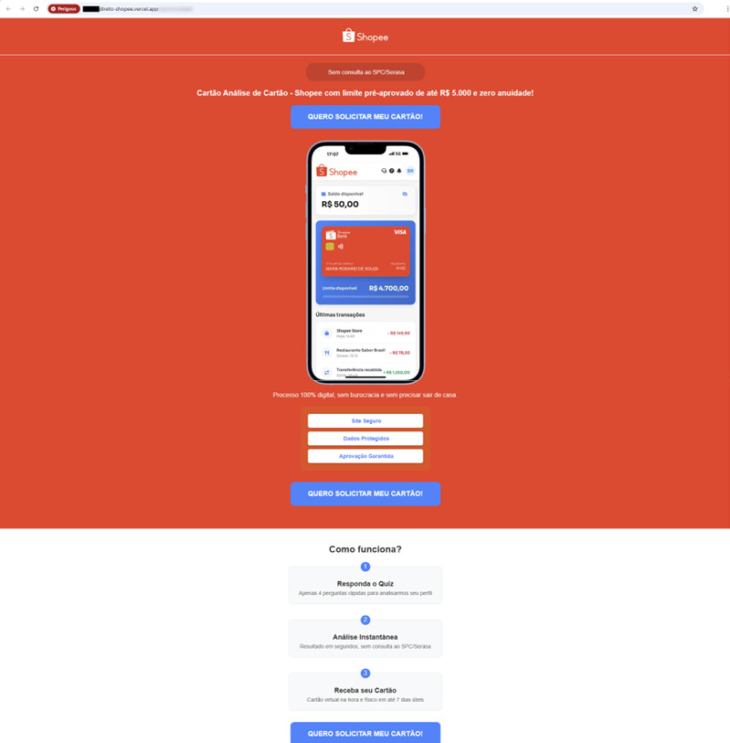 Campanhas digitais que simulam concessão de crédito e benefícios exclusivos estão sendo usadas para capturar CPFs. Ações fraudulentas associadas a falsas ofertas de cartão supostamente vinculadas à Shopee e a páginas que reproduzem promoções de grandes marcas, como a LATAM Airlines, estão envolvidas no esquema.
