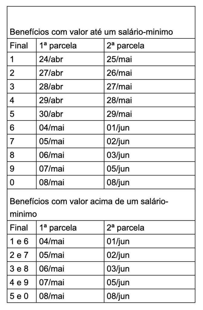 O calendário estabelece que a primeira parcela será depositada entre 24 de abril e 8 de maio. Já a segunda parcela está programada para o período de 25 de maio a 8 de junho. As datas seguem o modelo adotado pelo INSS, com base no número final do cartão de benefício, sem considerar o dígito verificador.