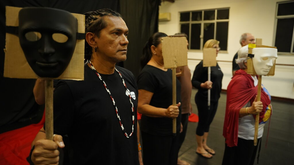 A dramaturgia e adaptação são de Adriano Barroso, que destaca o contraste entre matrizes culturais distintas como eixo da proposta. “Adaptar uma tragédia grega para o universo amazônico é uma das tarefas mais árduas, não só pela qualidade do texto (no caso de Sófocles) ou pela estrutura do drama, mas pela própria mitologia que difere muito entre os gregos e os ameríndios”, explica. Ele aprofunda a reflexão ao comparar cosmovisões: “na visão cosmológica indígena o que prevalece é a vida, e os povos entendem a necessidade da autorrealização da natureza. O que interessa é justamente o equilíbrio. Isso se choca com a visão materialista da cultura ocidental”.