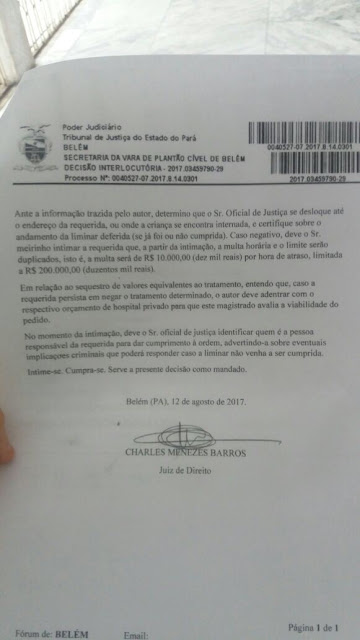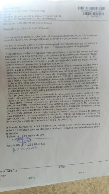 A pequena Mariana, de 9 anos de idade, corre risco de morte por falta de assistência médica, embora o juiz de plantão no Fórum Cível de Belém do Pará, Charles Menezes, tenha expedido liminar, ontem, determinando que seja submetida a cirurgia e a todo o tratamento médico-hospitalar de que necessita, sob pena de multa de multa de mil reais por hora, em caso de descumprimento da decisão, até agora ignorada pela Hapvida Assistência Médica Ltda.. Informado da desobediência, o magistrado já aumentou a multa para R$10 mil por hora de atraso, limitada a R$200 mil. E mandou o oficial de Justiça certificar o cumprimento da ordem, advertindo quanto às consequências criminais.