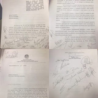 Dois requerimentos para abertura de Comissão Parlamentar de Inquérito foram protocolados durante a sessão de hoje na Alepa, um de iniciativa do líder do Governo, deputado Eliel Faustino(DEM), e outro do deputado Soldado Tércio (PROS).  A proposição de Eliel tem 18 assinaturas, prevê sete membros e funcionamento no período de noventa dias, podendo ser prorrogado o prazo por mais trinta dias. O objeto é investigar os danos ambientais na bacia hidrográfica do rio Pará, bem como suas causas, provocados pelos últimos eventos na região, inclusive o vazamento de rejeitos de material tóxico dos projetos industriais instalados no município de Barcarena(PA). A de Tércio tem 14 assinaturas, prevê cinco integrantes e prazo de 90 dias. O objeto a ser investigado, mais restrito, é “o dano ambiental praticado pela atuação da Hydro Alunorte, suas causas e as medidas a serem adotadas para evitar o desastre do rompimento das barragens ou outro desastre ambiental de grandes proporções para a população do Estado do Pará, em especial da região das ilhas”.
