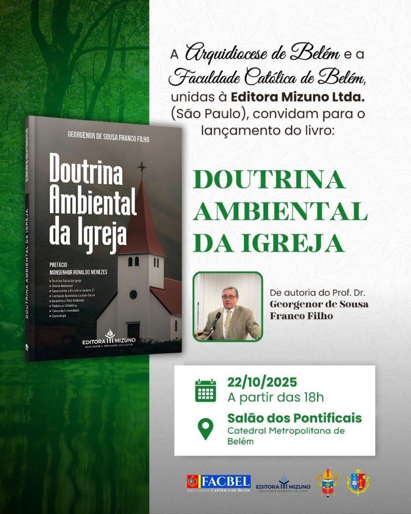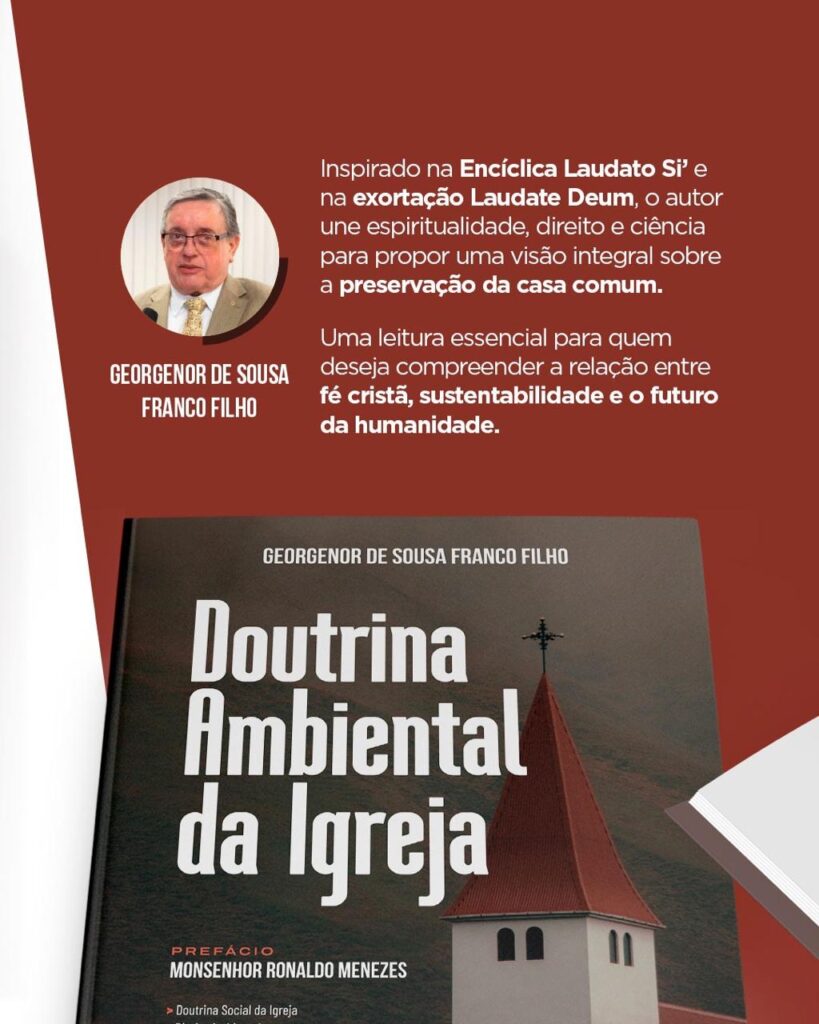 O professor doutor Georgenor de Sousa Franco Filho lança nesta quarta-feira, 22, às 18h, o livro Doutrina Ambiental da Igreja, na Catedral Metropolitana de Belém do Pará. Pioneira no Brasil a tratar desse tema, e quiçá no mundo, conforme destaca no prefácio o Monsenhor Ronaldo Menezes, vigário geral da Arquidiocese de Belém e membro da Academia Paraense de Letras, a obra convida a uma reflexão profunda e necessária acerca dos desafios ambientais do século XXI, articulando conceitos de direito ambiental, filosofia, teologia e ciências sociais, mostrando como a tradição da Igreja se mantém atual e relevante diante das mudanças climáticas e da crise ecológica global. A Amazônia ganha atenção especial, discutida em sua relação com a preservação ambiental, os povos originários e o futuro da humanidade.