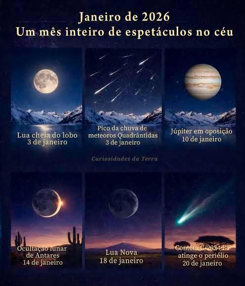 A primeira Superlua de 2026, no dia 3 de janeiro, será ainda mais especial: a lua cheia estará próxima de Júpiter, o planeta mais brilhante da noite. O fenômeno pode ser observado a olho nu e é chamada “Lua do Lobo” porque, nesta época do ano, era comum ouvir lobos uivando no Hemisfério Norte.   A chuva de meteoros Quadrântidas terá seu pico também em 3 de janeiro. Isso torna as condições de observação desfavoráveis, pois o luar apagará a maioria dos meteoros fracos. Ainda assim, algumas bolas de fogo brilhantes podem ser vistas.