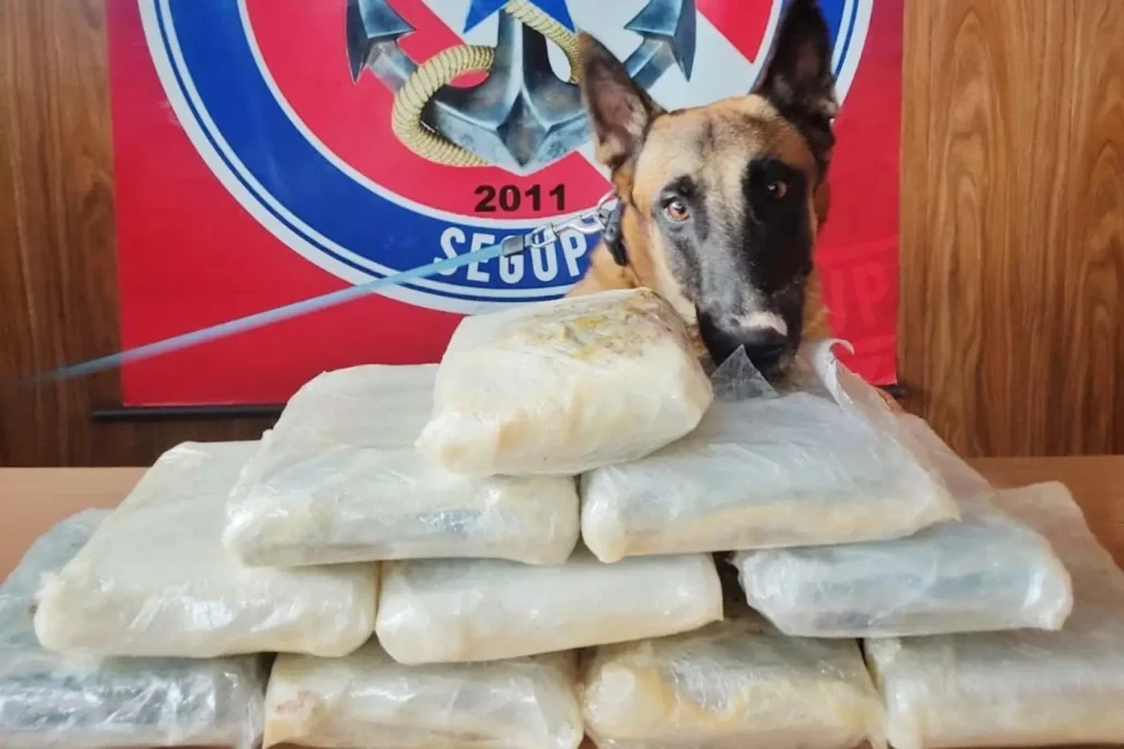 A droga estava escondida em caixas de papelão e era transportada como encomenda, estratégia usada para disfarçar o conteúdo ilícito e dificultar a identificação durante inspeções. O material foi encontrado dividido em dez tabletes, após abordagem da embarcação. A localização contou com o apoio do cão farejador Tupã, que indicou a presença da substância durante a vistoria.