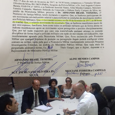 Coube ao promotor de justiça militar Armando Brasil por um ponto final no movimento das esposas dos policiais militares do Pará. Hoje, ele recebeu as senhoras que estão reivindicando melhorias salariais para os seus maridos, conversou com elas e ficou acertado que encerrariam imediatamente o bloqueio nos quartéis. Em troca, elas pediram que a Promotoria de Justiça Militar garanta que os PMs não serão presos e nem expulsos da corporação. O promotor assumiu o compromisso de apurar com rigor qualquer ameaça de retaliação e perseguição aos esposos. Se houver assédio moral será apurado pelo Ministério Público Militar, através da instauração de procedimento de investigação criminal. As mulheres estavam acompanhadas pelo vereador sargento Silvano e pelo advogado Augusto Barata.