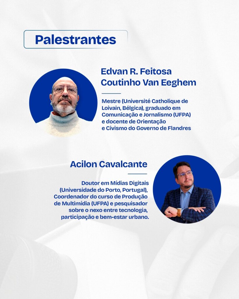 Também participa Acilon Cavalcante, doutor em Mídias Digitais pela Universidade do Porto, em Portugal, coordenador do curso de Produção de Multimídia da UFPA e pesquisador dedicado à relação entre tecnologia, participação social e bem-estar urbano.