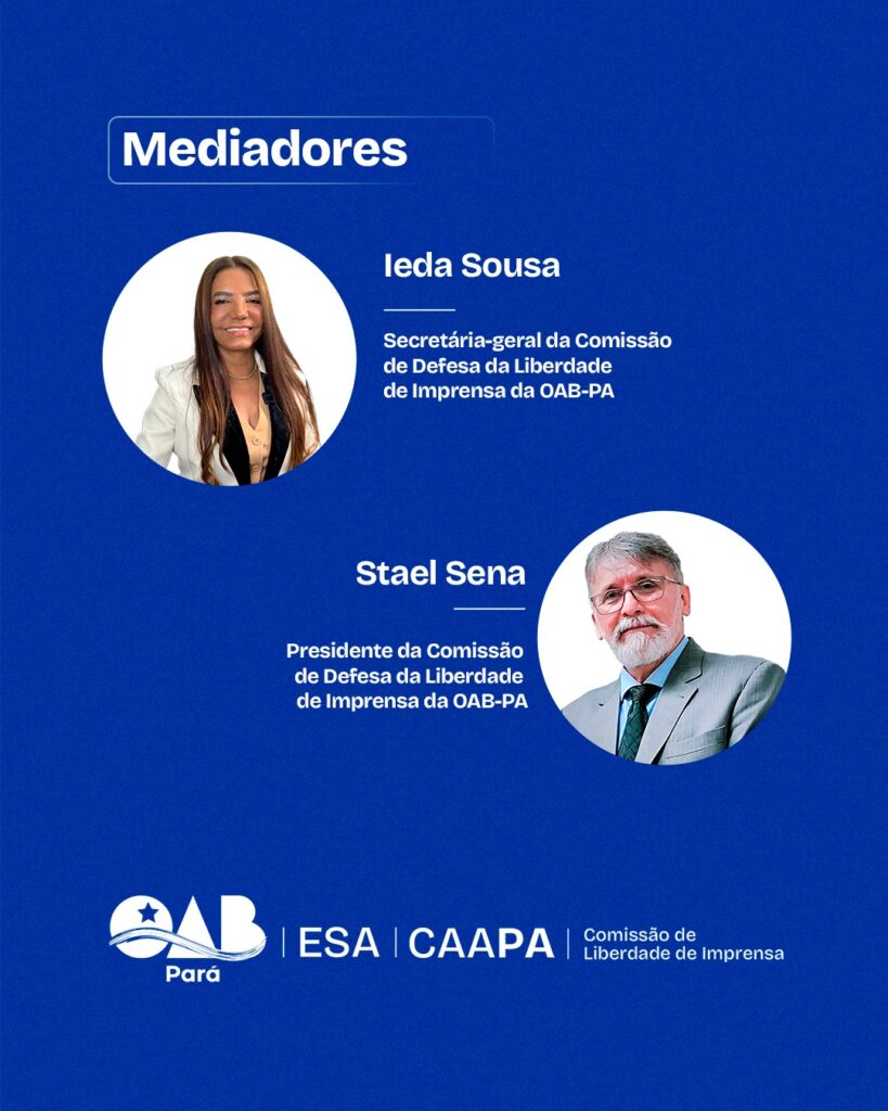 A mediação do encontro ficará a cargo de Ieda Sousa, secretária-geral da Comissão de Defesa da Liberdade de Imprensa da OAB-PA, e Stael Sena, presidente da mesma comissão.