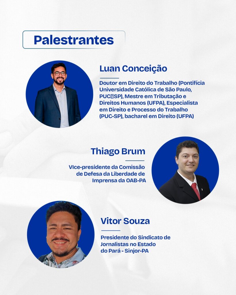 A mesa inclui ainda Luan Conceição, doutor em Direito do Trabalho pela Pontifícia Universidade Católica de São Paulo (PUC-SP), mestre em Tributação e Direitos Humanos pela UFPA, especialista em Direito e Processo do Trabalho e bacharel em Direito pela mesma instituição.