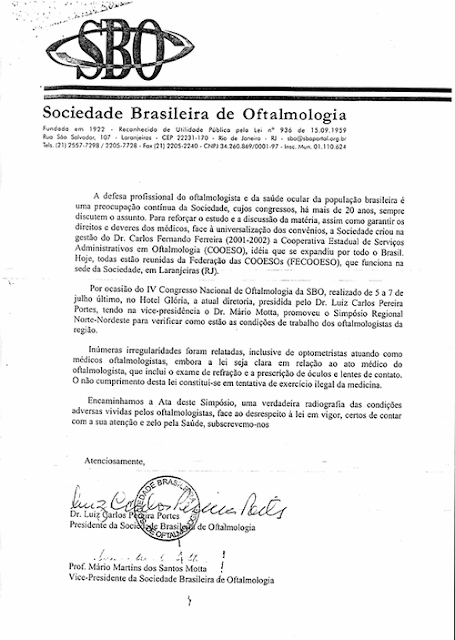 O Ministério da Saúde é taxativo: optometristas não podem praticar oftalmologia. A confirmação está na Nota Técnica n° 281/2007, de 9 de outubro de 2007. Vejam aí embaixo a receita e leiam a manifestação oficial da Sociedade Brasileira de Oftalmologia. Cabe ao Ministério Público apurar o porquê dessa ação da Prefeitura de Benevides, os danos causados à saúde dos munícipes e os riscos a que foram expostos, além da aplicação do dinheiro público.