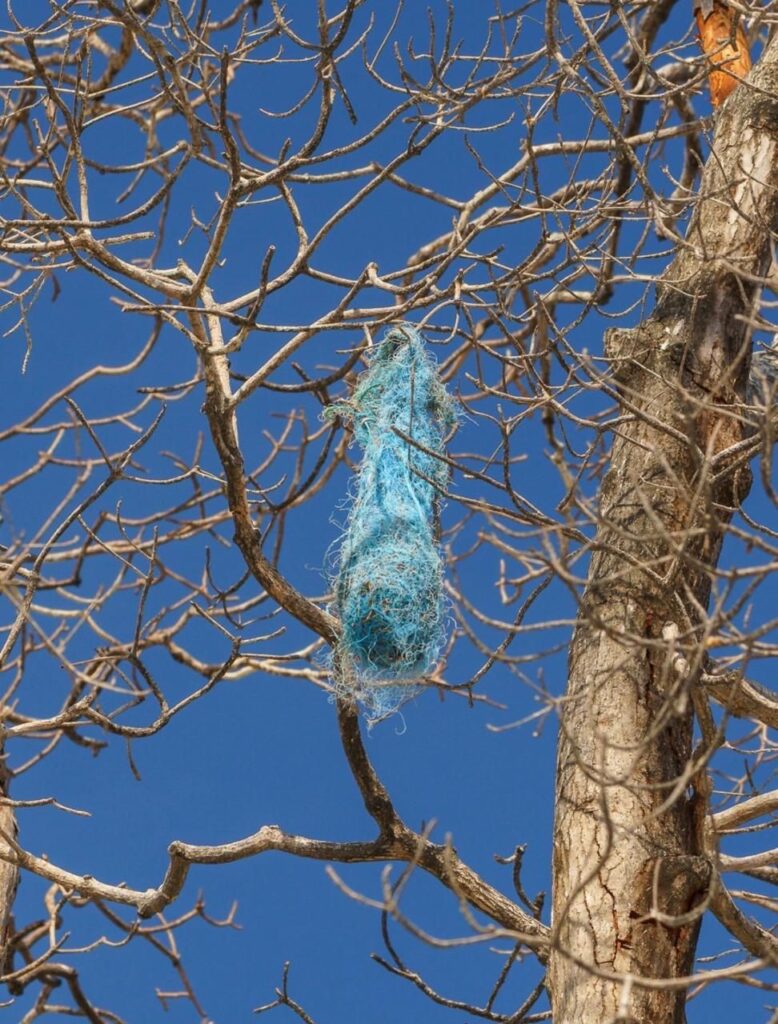 Ninhos azuis, tecidos com resíduos de redes de pesca que os pássaros recolhem, estão ficando muito frequentes na Vila de Pescadores de Ajuruteua, em Bragança, e em muitas praias no Pará.
