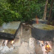 Rale a mandioca, esprema o caldo e coloque para cozinhar com bastante alho.