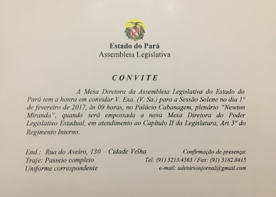 Em sessão histórica, o deputado Márcio Miranda toma posse amanhã pela terceira vez consecutiva como presidente da Assembleia Legislativa do Pará. Quem não recebeu o convite aí em cima, destinado a personalidades que entrarão em plenário, não precisa se preocupar: a Alepa é aberta a qualquer cidadão, da galeria dá para ver tudo e a roupa só precisa ser condizente com órgão público.