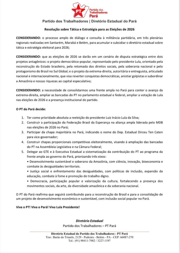Em nota oficial, o diretório estadual petista lembrou que houve amplo diálogo e consulta à militância partidária, em três plenárias regionais realizadas em Santarém, Marabá e Belém. E justificou a decisão em razão da necessidade de uma frente no Pará capaz de conter o avanço da extrema-direita, ampliar as bancadas do PT no parlamento estadual e federal, a votação de Lula nas eleições de 2026 e a presença institucional do partido.