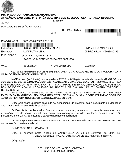 empresário Alcidemar Leal, expedido pelo juiz Fernando de Jesus Lobato, da 4ª Vara