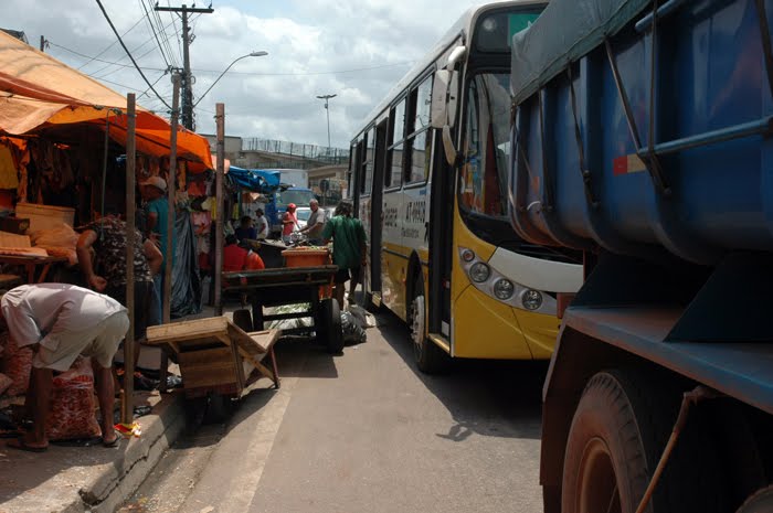 Camelôs e feiras ocupam calçadas e até parte das ruas. Passageiros de ônibus são obrigados a subir e descer da condução sem a mínima segurança.