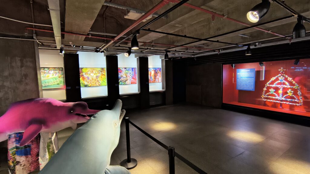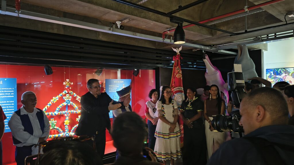 Durante o cortejo que conduziu o público até a sala da exposição, o ambiente virou um “portal” para a festa amazônica, com a ornamentação dialogando com as telas fotográficas expostas. Na ocasião, o Museu de Arte Sacra recebeu dois presentes: uma tela e um Arco do Sairé, confeccionado pela comunidade Borari de Alter do Chão.