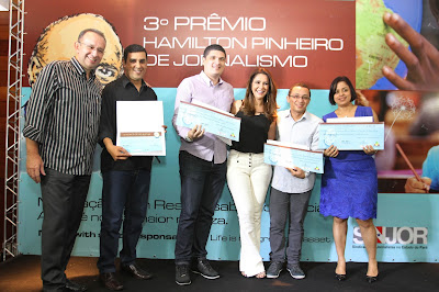 Em uma festa bonita e animada no hotel Quinta das Pedras, ontem à noite, o presidente do Simineral, José Fernando Gomes Júnior, e a presidente do Sinjor-PA, jornalista Roberta Vilanova, anunciaram os vencedores do Prêmio Hamilton Pinheiro de Jornalismo: Bruno Magno – que venceu na categoria Webjornalismo e em segundo lugar geral; Fabrício Queiroz, ganhador em Jornalismo Impresso e terceiro lugar geral; Celso Freire, campeão na categoria Radiojornalismo, e Márcio Antunes, vencedor na categoria Revista Especializada e que também conquistou o primeiro lugar geral, recebendo o prêmio de R$ 8 mil. Os demais receberam R$4 mil cada. Ele trabalha na revista Mineração & Sustentabilidade, de Minas Gerais, não conseguiu vir a Belém e foi representado por Roberta Vilanova. A jornalista Layse Santos funcionou como mestre de cerimônia da noite. Os jurados foram os jornalistas Mauro Neto, Pedro Loureiro, Selma Amaral, Lenne Tavares e Franssinete Florenzano. As fotos são de Cristino Martins.