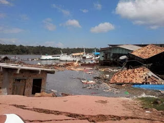 Hoje de manhã, em Abaetetuba (PA), a rua Siqueira Mendes, no bairro de São João, que fica na beira do rio Maratauíra, afundou e destruiu 30 residências e estabelecimentos comerciais, além de veículos. Não há registro de mortes. A rua, de piçarra, não resistiu à força da erosão, que engoliu casas e veículos. Dezenas de outras casas, em ruas já com voçorocas, ainda correm risco de desabar.