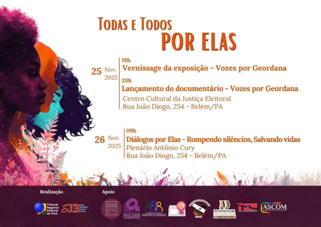Amanhã, no Centro Cultural da Justiça Eleitoral, prédio anexo à sede do TRE do Pará, às 19h, haverá o vernissage da exposição “Vozes por Geordana”, seguida da exibição do documentário de mesmo nome. Geordana Farias, jovem negra que morava no município de Ananindeua, no Pará, foi morta aos 20 anos, em 2021, pelo namorado que não aceitou o fim do relacionamento.