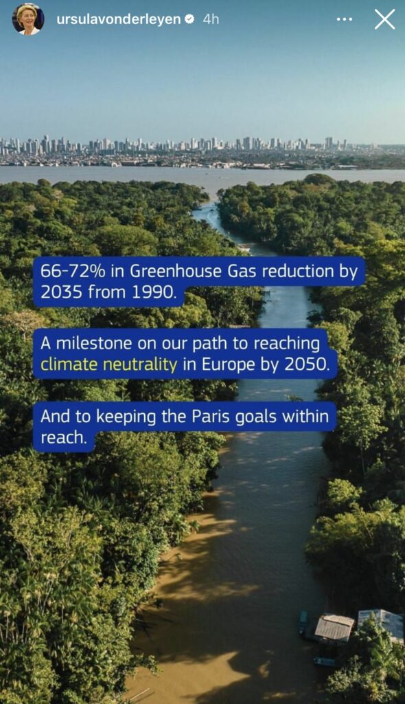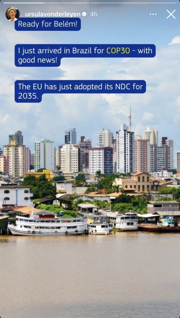 A União Europeia formalizou, nesta quarta-feira, 5 de novembro, a sua Contribuição Nacionalmente Determinada (NDC) atualizada, documento que estabelece as metas e estratégias de redução de emissões de gases de efeito estufa (GEE) até 2035. A proposta, aprovada pelo Conselho da UE, será submetida à Convenção-Quadro das Nações Unidas sobre Mudança do Clima (UNFCCC) antes da realização da COP30. A presidenta da Comissão Europeia, Ursula von der Leyen, que já chegou em Belém, comemorou nas redes sociais.